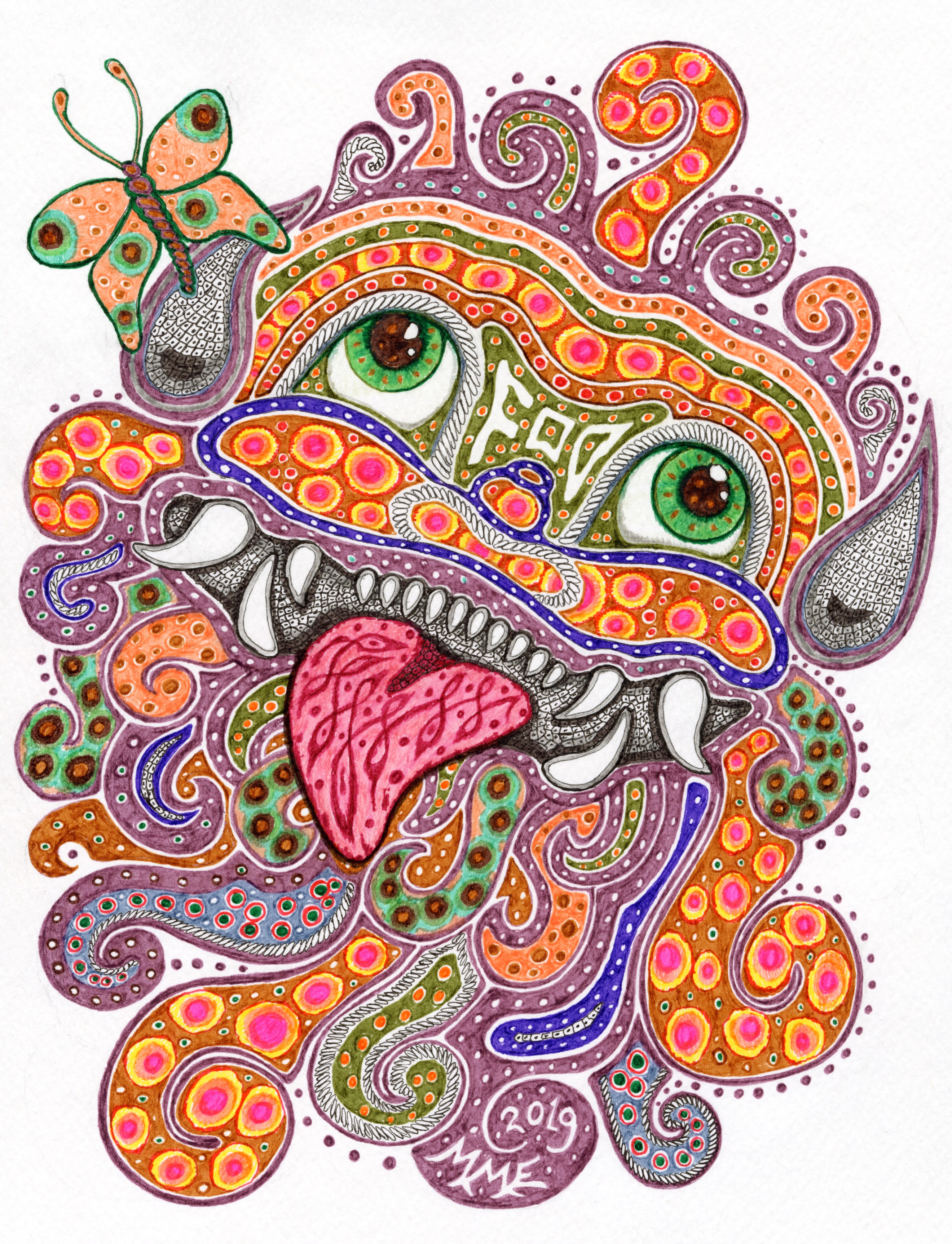 Stylized little California porcupine greets a butterfly, drawing by Meredith Eliassen, 2018.