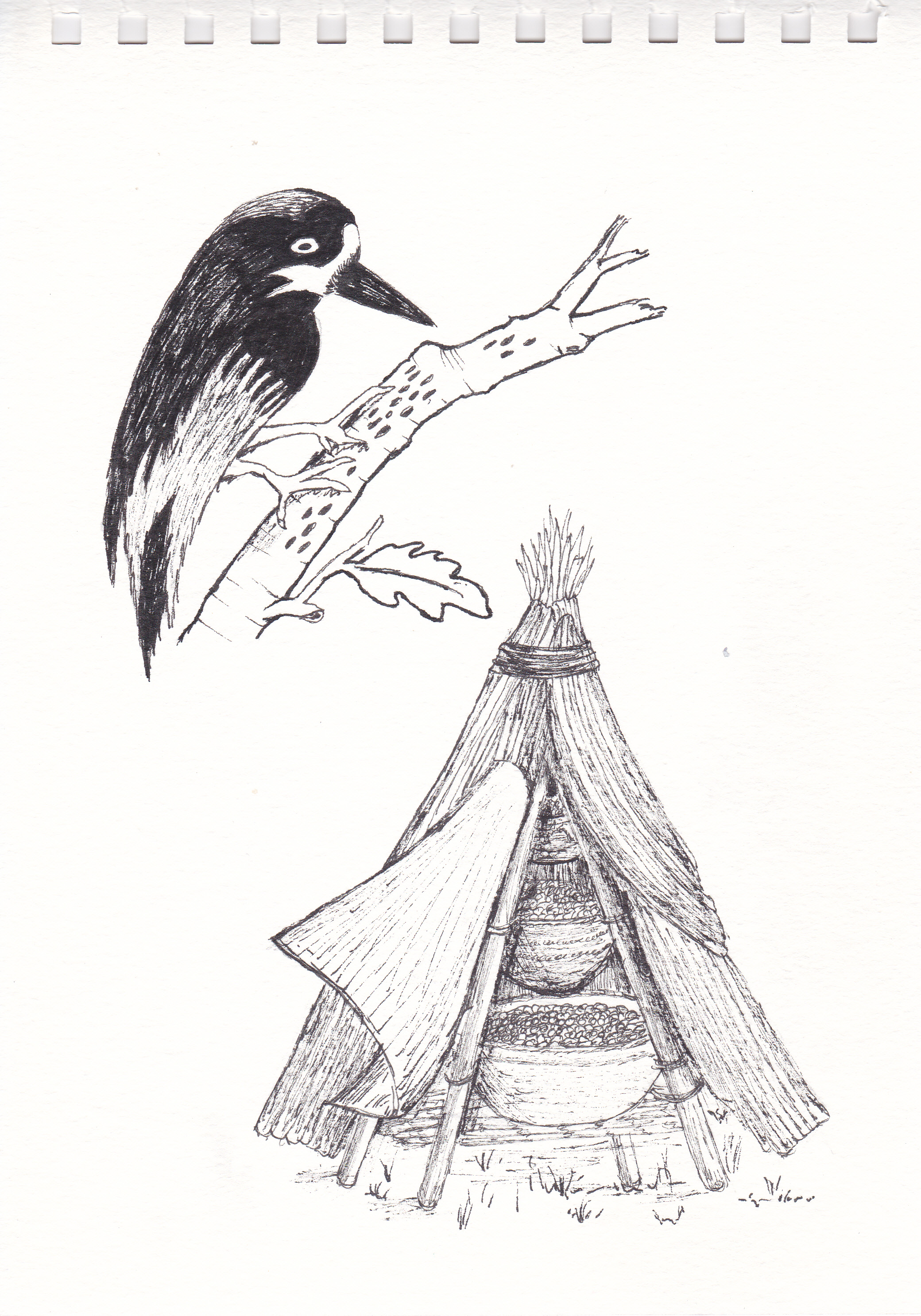 California Indian artistry was reflected in pragmatic ways with their fine nets for carrying burdens, trapping birds and fish. A Pomo burden net made of Indian hemp Apocynum cannabinum fiber cordage with trade Coast Miwok clamshell beads would have held a burden basket, and was used to transport things on an individual’s back using the headband to balance the load. Baskets were used to gather, prepare, store, and serve food. Coiled baskets made from slender willow branches were stitched into place with fine threads made from the underground rhizomes of the sedge plant. The warp and weft, and coiling were terms connected transferring knowledge for making coiled cooking baskets, basket hoppers and coiled cups. Large tightly woven-cooking baskets made from roots that were soaked efficiently hold water to withstand basket boiling to cook acorn mush and other foods. The hopper basket mortar was placed on the ground and the hopper basket constructed from small nicely scraped coiled shoots was placed on top. Water and acorn meal were placed into the basket then hot rocks were dropped in, bringing the content to a boil within minutes.