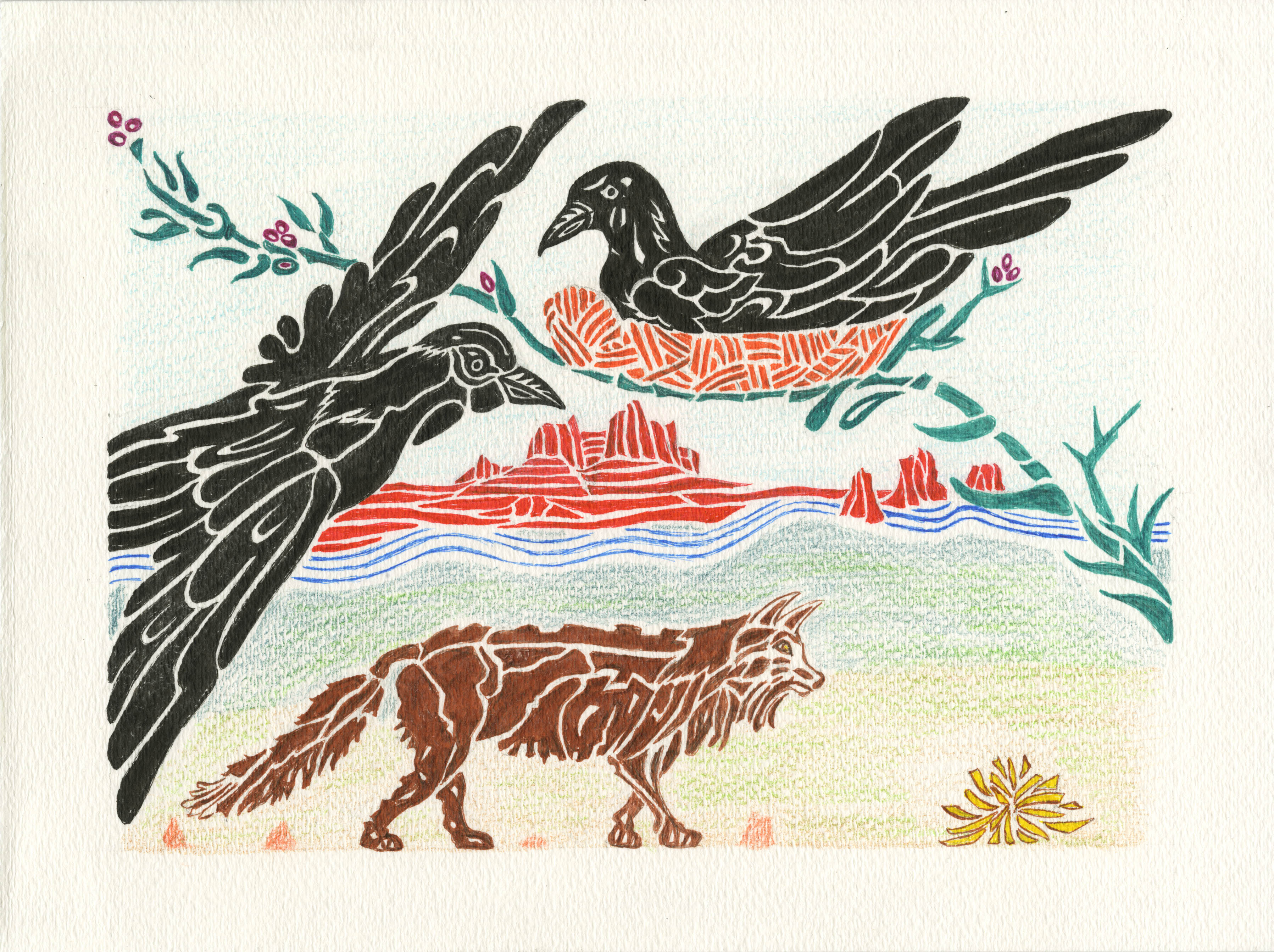 Oblivious to any agitation above him, Old Coyote enjoys a morning stroll in the desert. Meanwhile, Momma Raven keeps her nest secure as Poppa Raven protects his family above the Red Rocks of Sedona, Arizona. These rocks really are red!