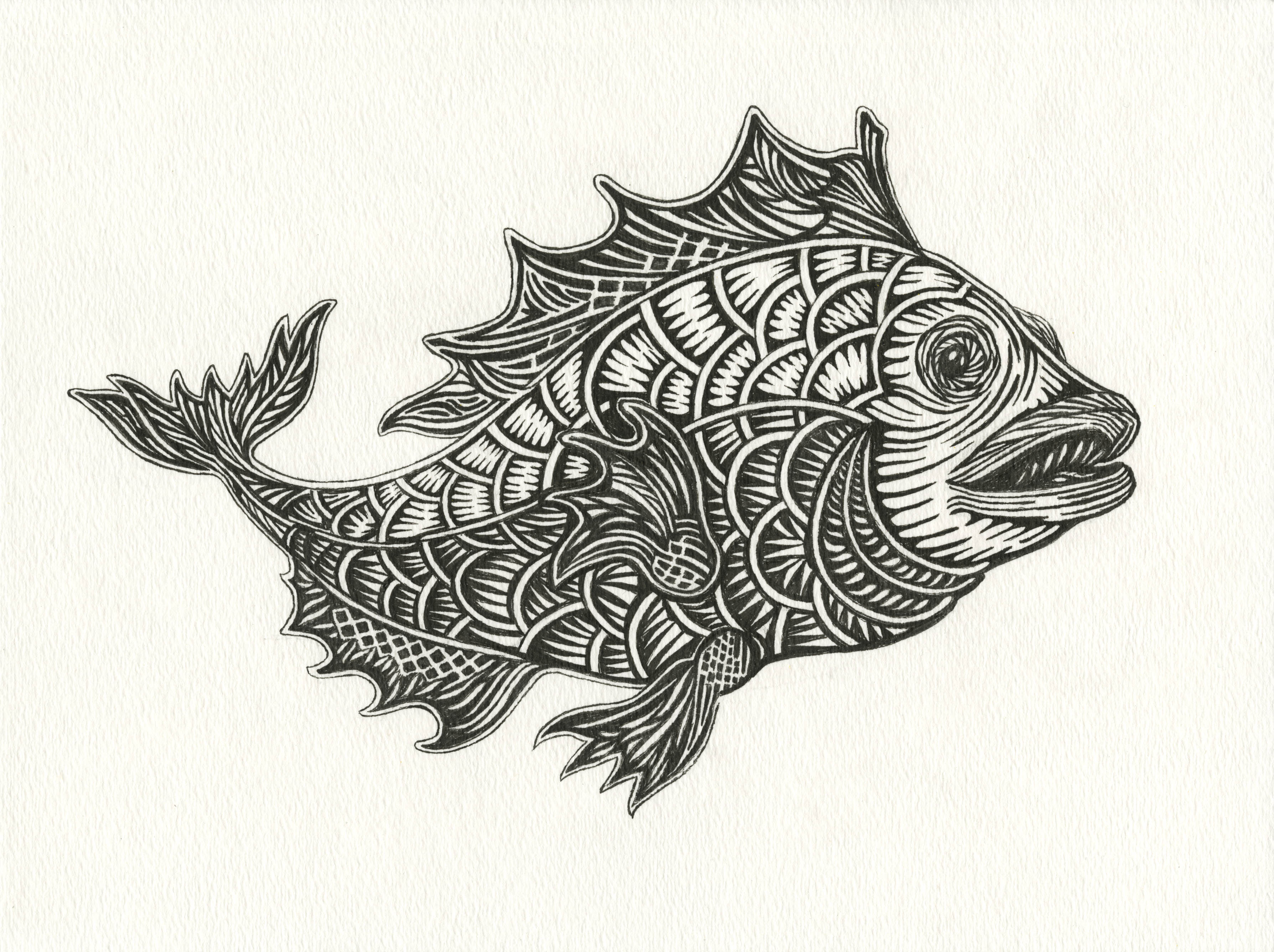 I had been practicing drawing working with an image from an Etruscan vase of a female dancer without much luck last week… the drawings worked but they were not worthy of posting. Then a series of rain storms came through the Bay Area and I was stuck indoors for a while. This picture of a jewel-tone fish came into my mind and I started to draw. I have not colored it yet because it has an interesting “woodcut” quality which I am going to share before attacking it with color.
